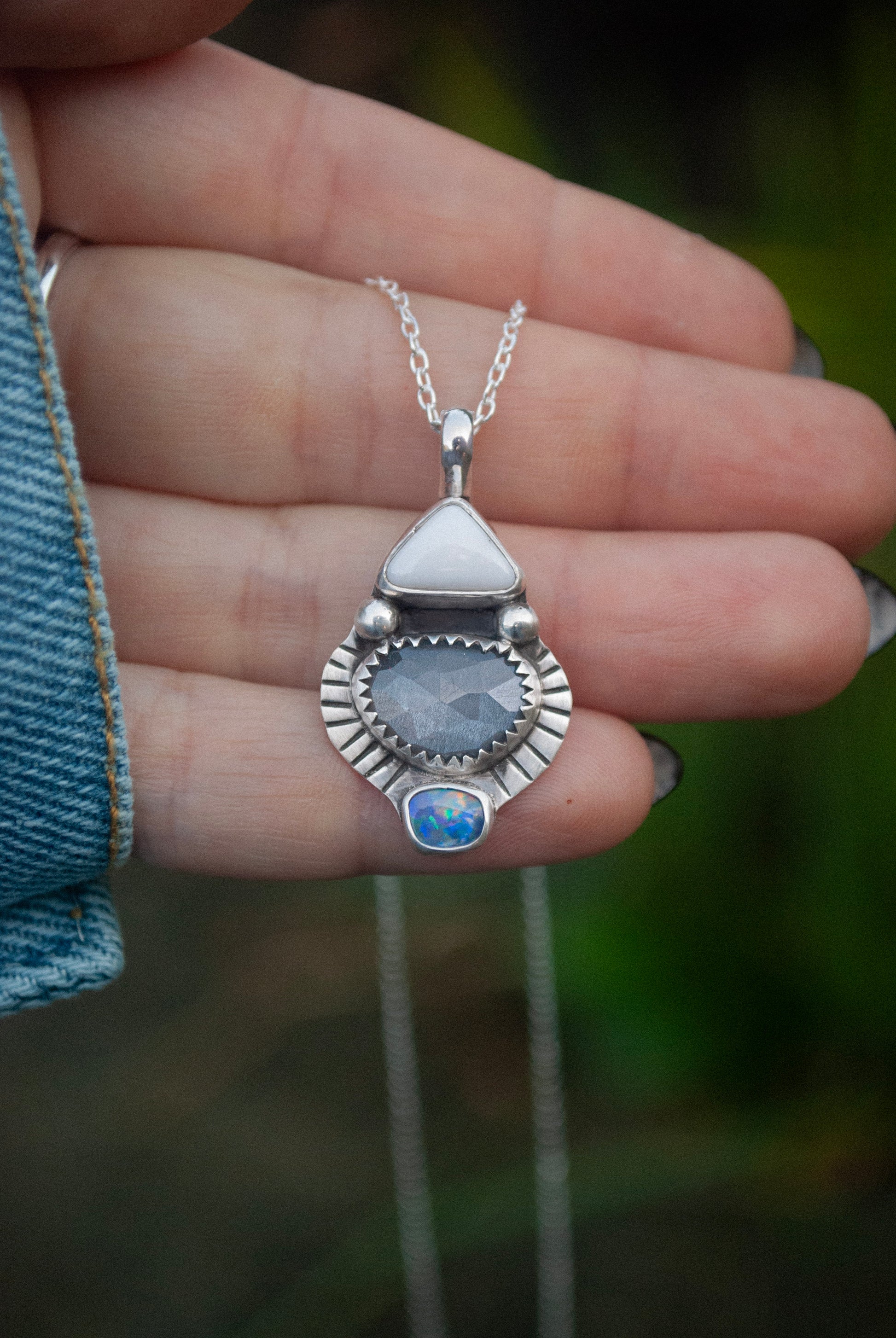 A unique combo of White Buffalo, Gray Moonstone and a tiny Australian Opal Doublet. This sweet combo of stones came together by instinct, and I fell in love with the soft white, gray and sparkly lavender hues that opal provides. This kind of piece is exactly what I mean by one of a kind - something that cannot be recreated!